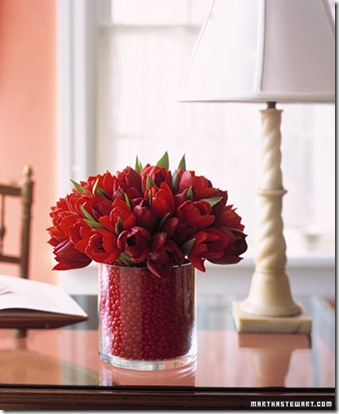i love the use of red hots and hearts in the bottom of the vase in the two arrangements below.